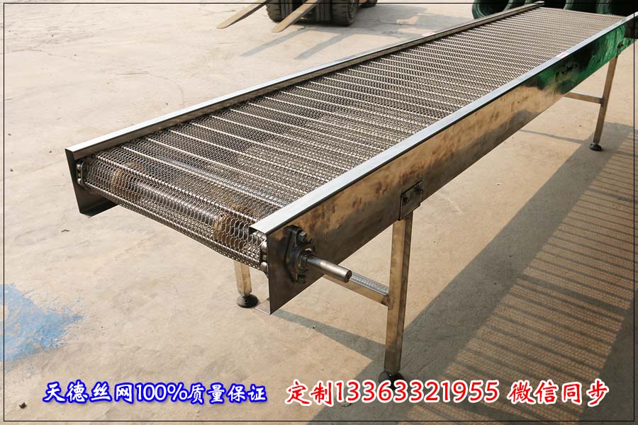 天德絲網生產金屬網帶輸送 機,鏈板輸送機,網鏈輸送機,長城網帶輸送機等流水線輸送設備 ,下面介紹以下網帶輸送機的特點: 金屬網帶輸送機采用不銹鋼網帶作為輸送載體,驅動方式有減速電機驅動,調 速方式有變頻調速。機身材質有不銹鋼、碳鋼、鍍鋅板等。網帶輸送機適用于各行業烘干、去濕、降溫、清洗、速凍等工藝。