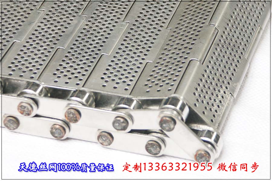 一般的鏈板表面是不需要進行打孔處理的,在輸送鏈板的表面進行打孔或者是添加側擋板以及橫向擋板等要求都屬于特殊加工的要求,如果需要在鏈板金屬輸送帶的表面進行加工一定要與銷售人員工溝通清楚,防止報價的金屬輸送帶與您所需要的有所不同。鄭總訂購的蘋果清洗分揀不銹鋼輸送帶的總寬度為820mm,鏈板的板厚為1.2mm,沖孔直徑根據鄭總的要求做 的是5mm,串桿的加工直徑為6mm,鏈板兩側的傳動鏈條的節距為38.1mm,因為長期在水中使用材質為全部304不銹鋼。