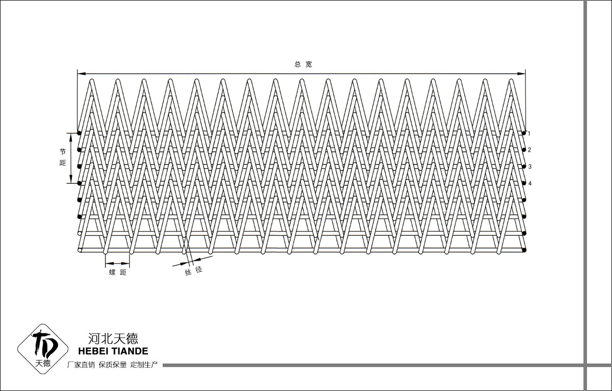 人字形網帶由左右交替的網條通過四根直串條聯結而成,準確的編織技術使網帶既具有密度、高網孔、細運行靈活的特點,它對材料和編織技術要求高。